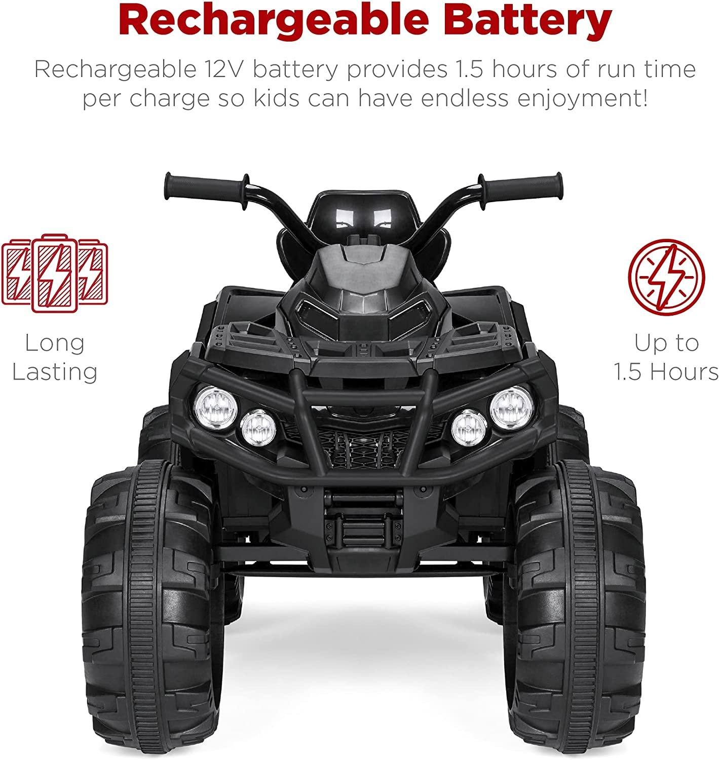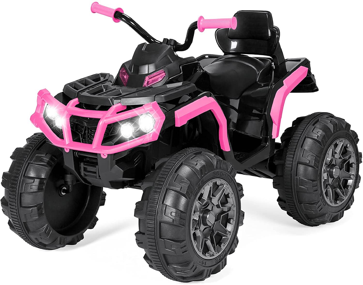 - LARGE, TREADED WHEELS: With 4-wheel suspension, it can conquer grass, dirt, driveways, and sidewalks, while LED headlights and a horn create a fun and realistic ATV experience!