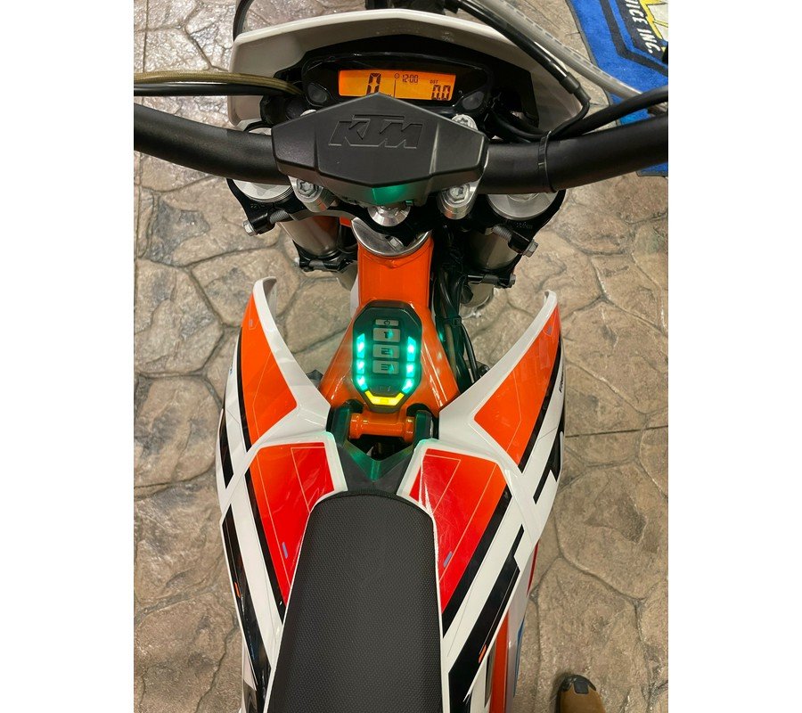 - DISPLAY: The multifunctional display between the steering head and seat allows the rider to select one of three different power delivery modes. In addition, a chain of LEDs, colored green to red, provides a visual indication of the charge remaining in the KTM PowerPack, with the red LED starting to flash and the bike automatically entering “limp home mode“ as soon as the charge drops below 10 %. In addition, error codes are indicated by the red LED flashing in different frequencies.
