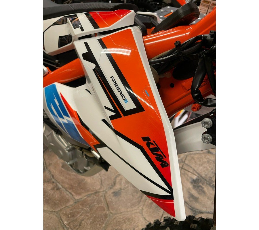 - BODYWORK & GRAPHICS: With in-mold graphics providing a rugged and lightweight solution for the latest design, the new KTM FREERIDE E-XC’s modern and ergonomical new bodywork provides lots of rider mobility with excellent contact patches, as well as narrow seat and spoiler lines. Integrating a more efficient front light, the new headlight mask hooks into a newly designed fender. Open handguards are now standard equipment.